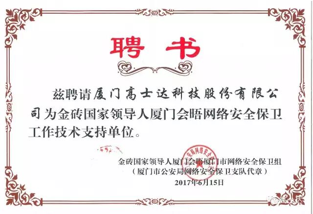 举世瞩目的金砖五国会议如期于2017年9月3日至5日在厦门隆重举行。作为金砖峰会网络安保和应急支撑工作的主要技术支持单位,高士达科技历时半年的精心准备,投入30多位技术骨干参与到峰会期间政府与各单位网络安保服务,圆满完成了政府相关机构的金砖保障任务,为厦门金砖会议保驾护航,赢得了客户肯定与认可。